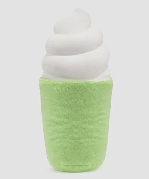 This toy features a squeaky plush body with a bouncy latex “cream” top, giving pups two playful textures in every bite