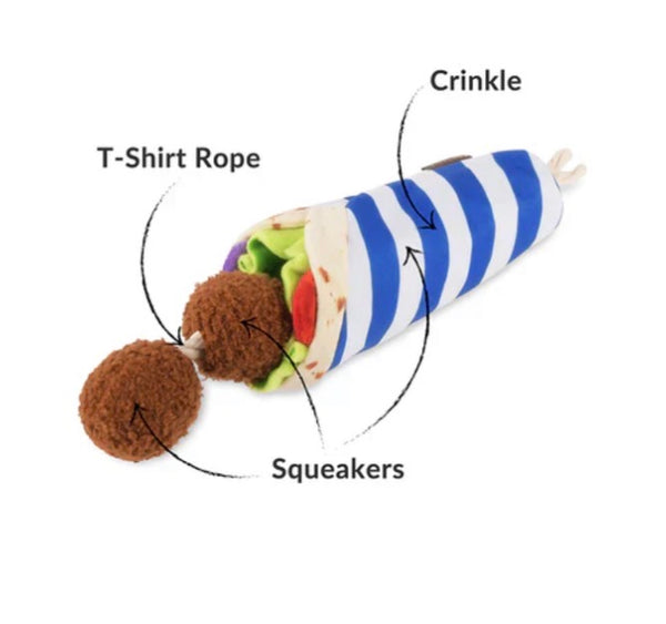 With two squeaky meatballs on a sliding rope, crinkly veggie layers and room to stash treats inside, this plush toy delivers endless tugging, twisting and squeaking fun for dogs with a taste for global adventure