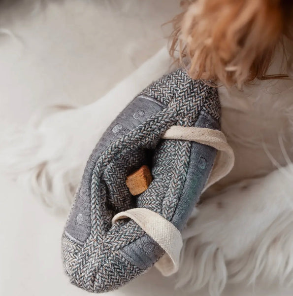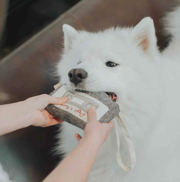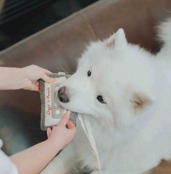 The snuffle CASSETTE features a durable, cassette design with a hidden snuffle pocket where you can tuck away your dog’s favourite treats or kibble with a ribbon for a challenge!